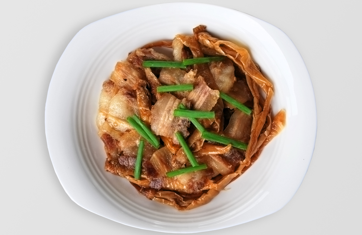 2、将回锅肉放入锅内,加少许盐入味炒香,加入生抽翻炒